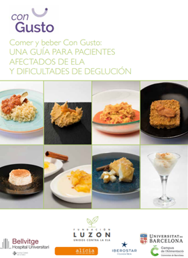 Guía que ofrece modelos de alimentación para enfermos de ELA que faciliten la tarea de realizar recetas asequibles y apetitosas, además de adecuadas nutricionalmente. Proyecto realizado en colaboración con los servicios de neurología y de endocrinología y nutrición del Hospital Universitario de Bellvitge de l’Hospitalet de Llobregat (Barcelona), la Universidad de Barcelona y la Fundación Alícia.